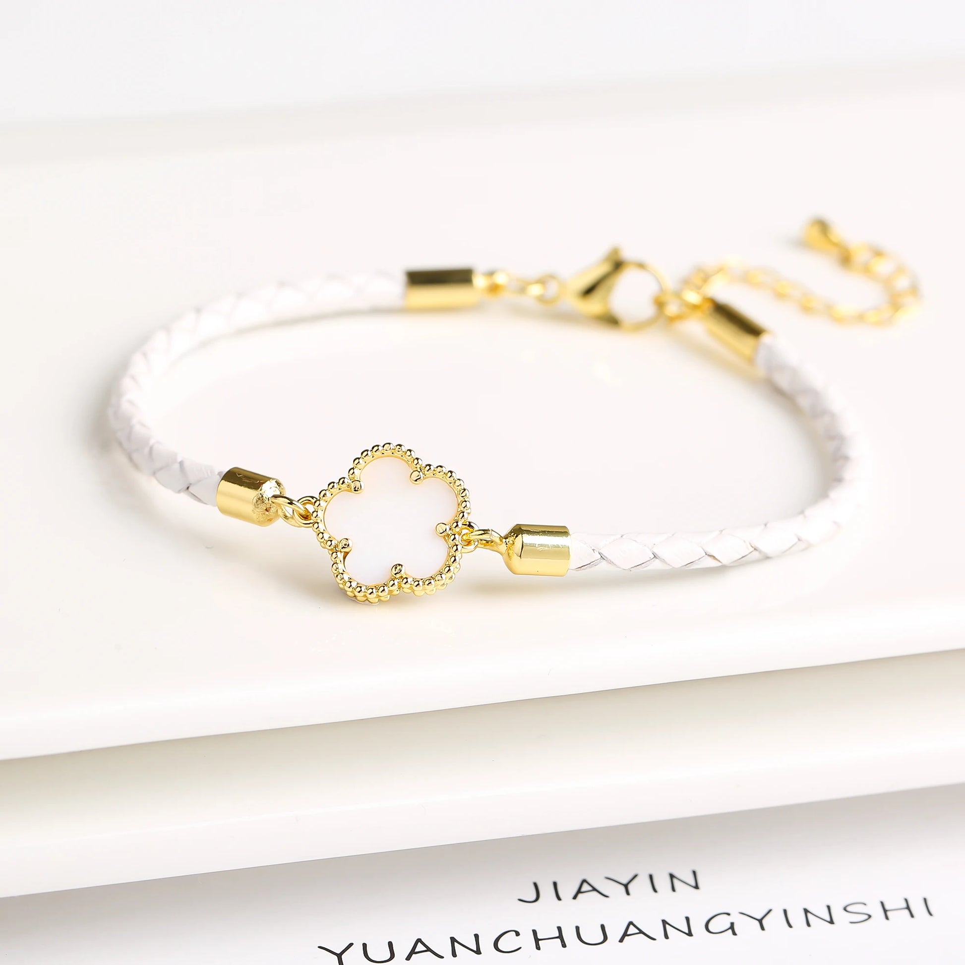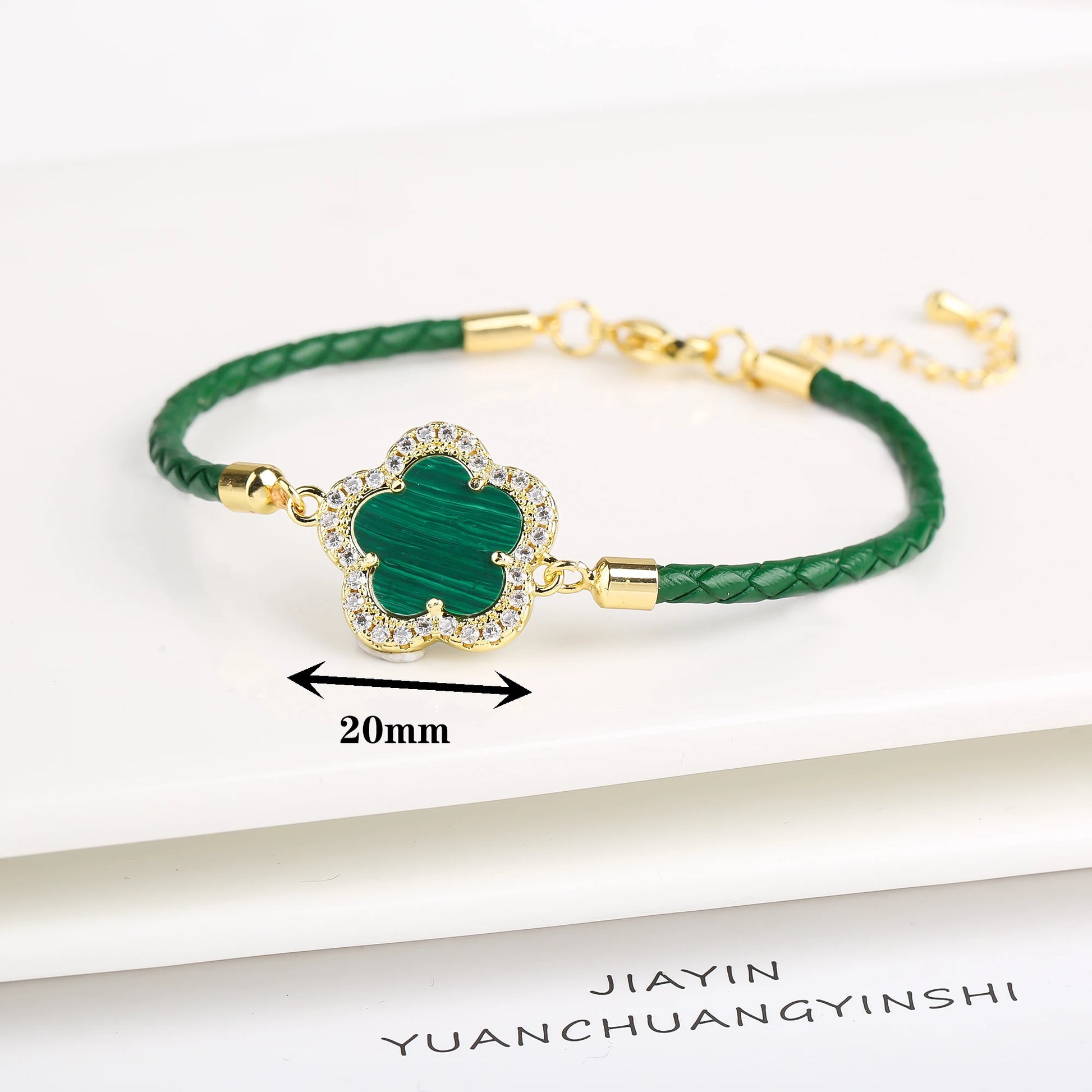 Five-Leaf Flower Natural Stone Bracelet – Chic Woven Leather Jewelry for Women.